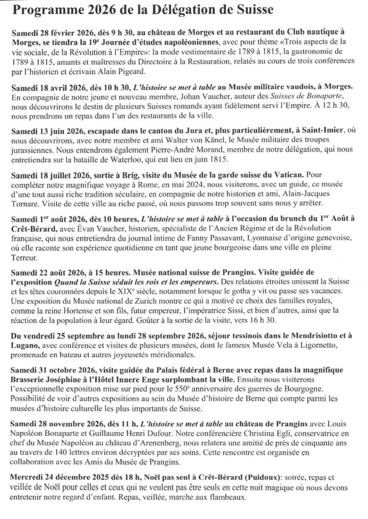 Programme 2026 de la Délégation Suisse du Souvenir Napoléonien